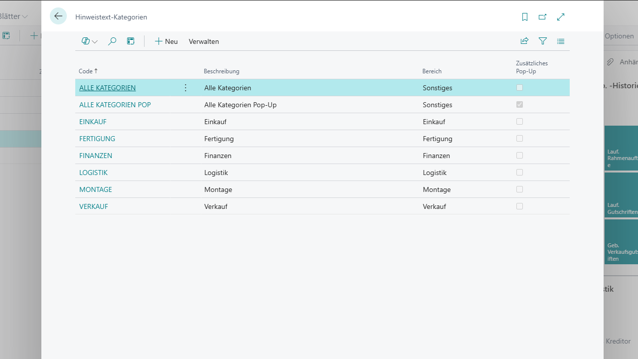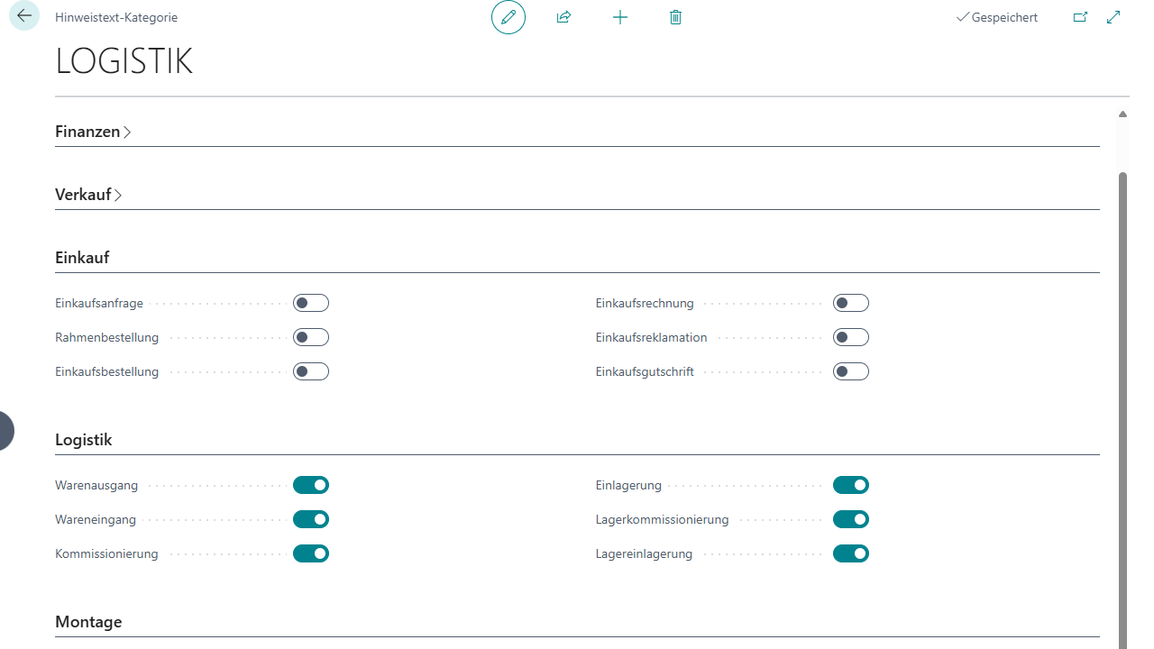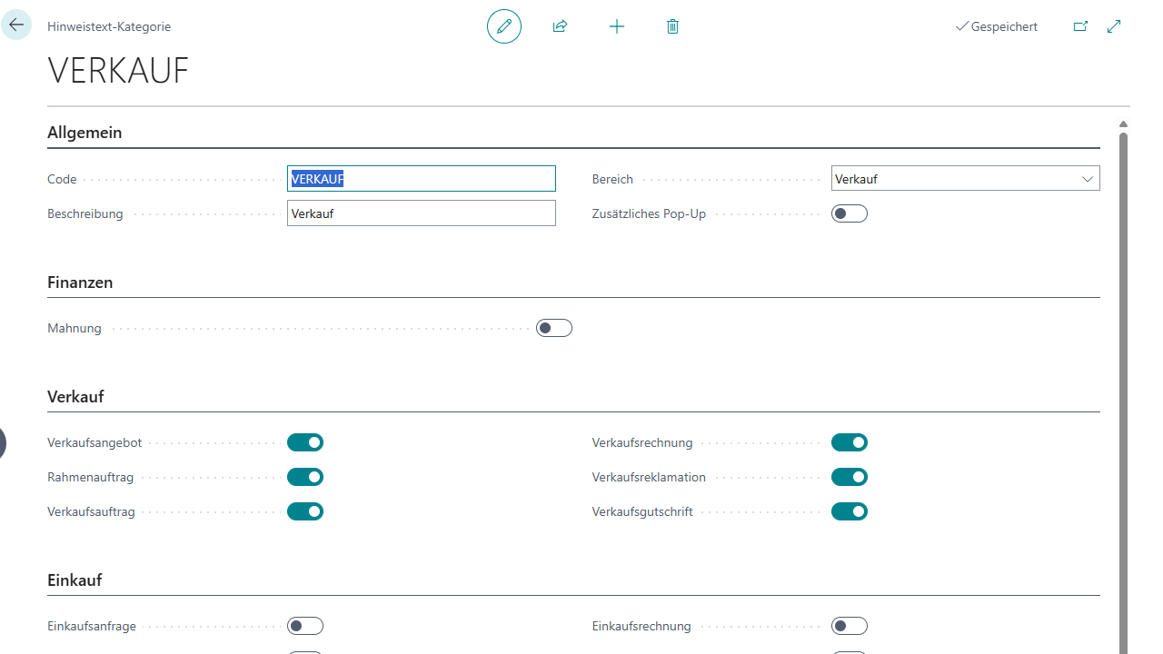 Ordnen Sie Hinweistexte frei definierten Kategorien zu und steuern Sie, in welchen Belegarten diese angezeigt werden. Bereiche wie Verkauf, Einkauf, Logistik, Montage oder Finanzen bieten maximale Flexibilität.
