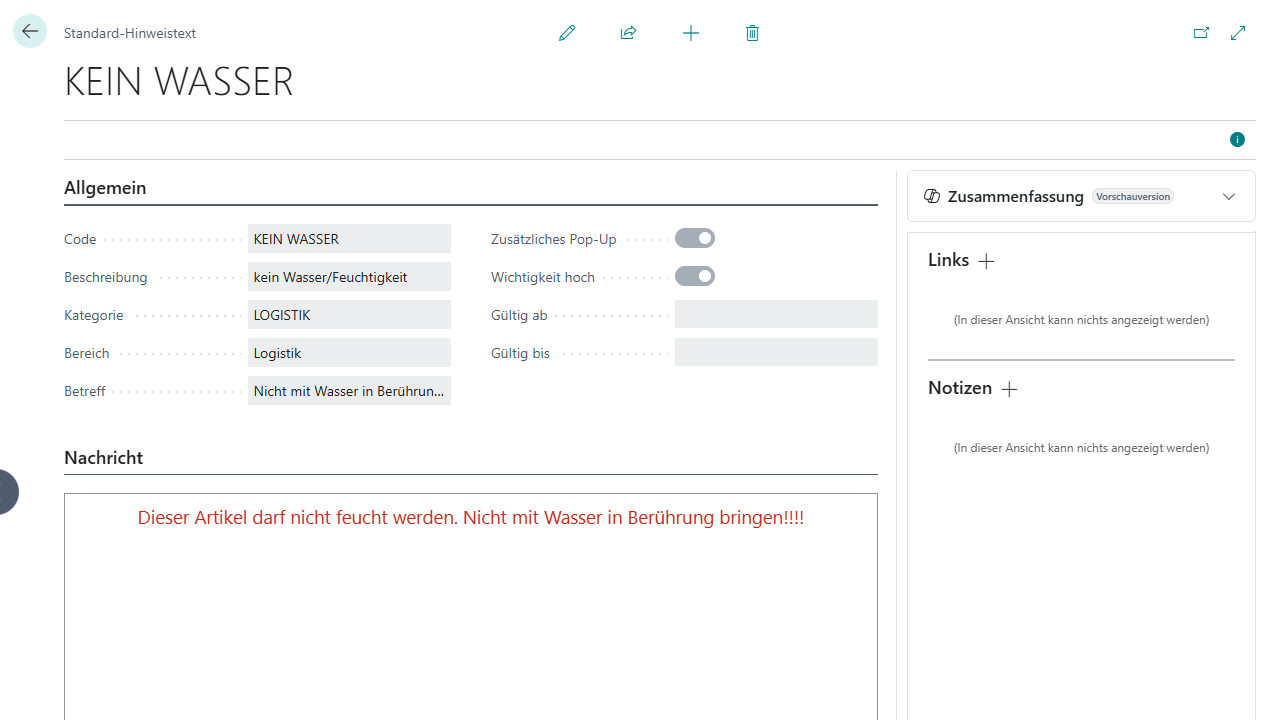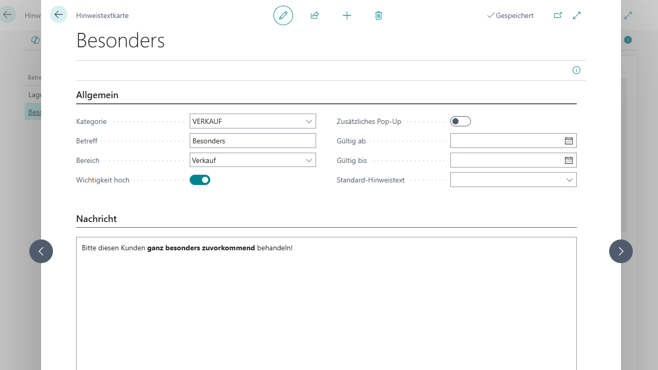 Erstellen Sie Standard-Hinweistexte, um häufig genutzte Hinweise zentral zu pflegen und schnell mehreren Stammdatensätzen zuzuweisen. Das spart Zeit und sorgt für einheitliche Kommunikation.