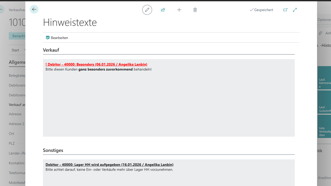 Die Benachrichtigung, dass Hinweistexte vorhanden sind, wird automatisch beim Öffnen oder Erfassen eines Belegs eingeblendet – genau dann, wenn sie benötigt werden. So behalten Anwender relevante Details im Blick, ohne aktiv danach suchen zu müssen.